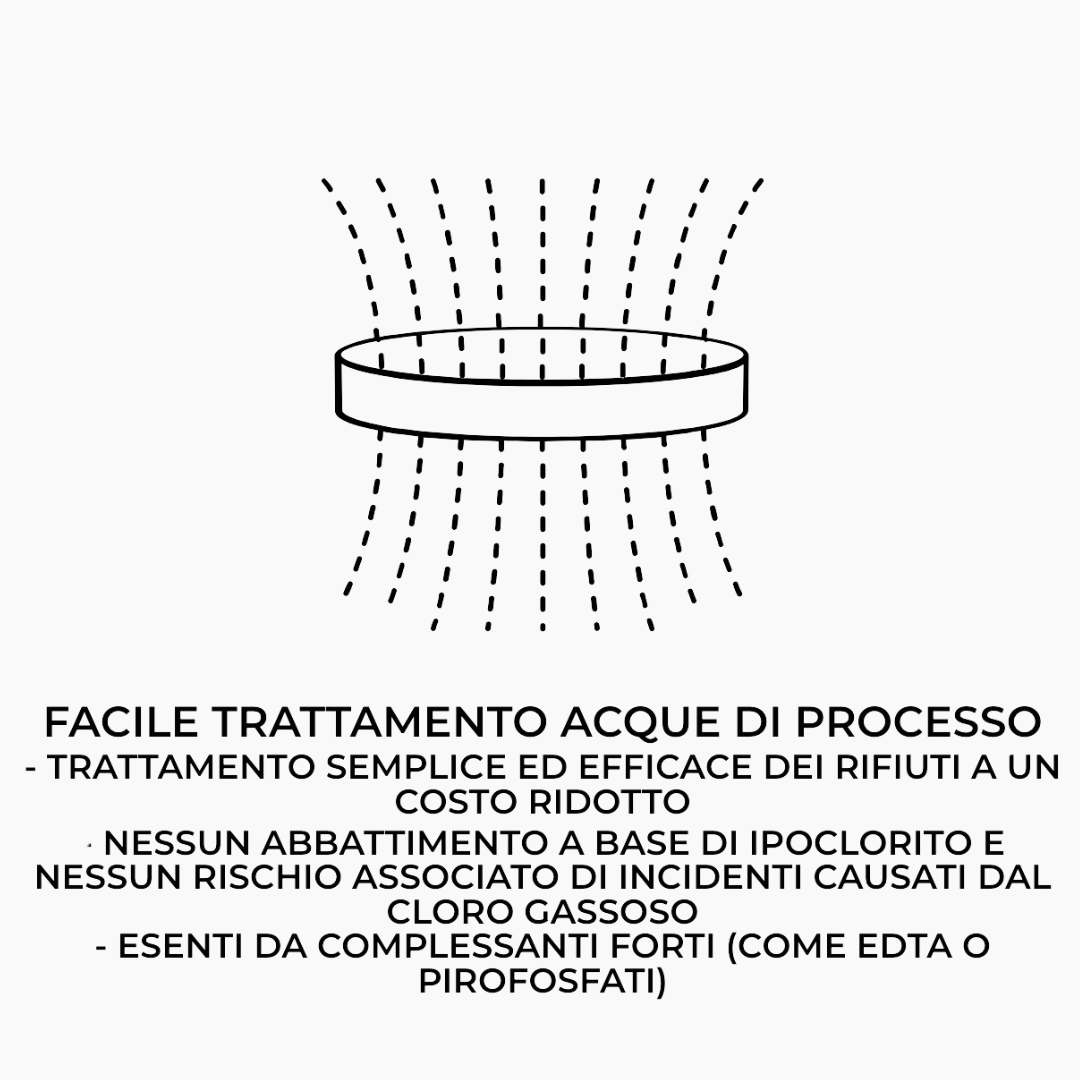 La sostenibilità del processo è sostanziale in tutte le fasi di lavorazione dato che consente un facile trattamento delle acque di processo, dei rifiuti, nessun abbattimento a base di ipoclorito e nessun rischio associato di incidenti causati da cloro gassoso per una maggiore sicurezza degli operatori.